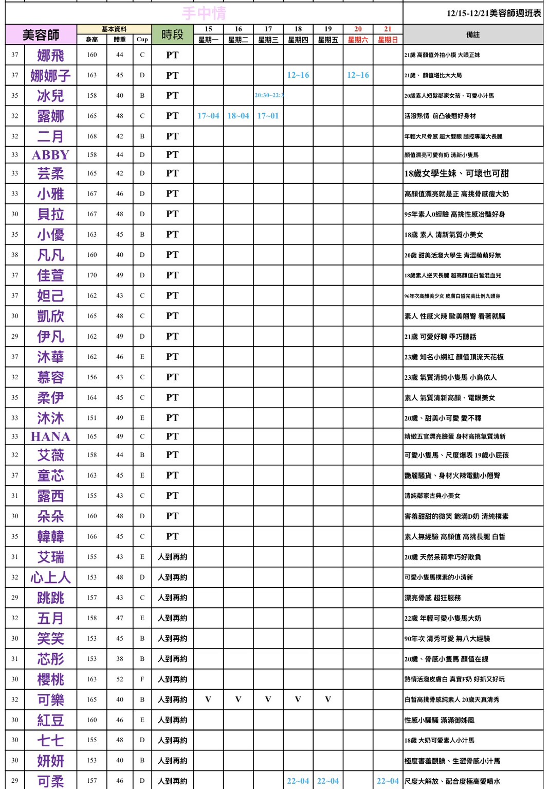 - PT:兼職=想來才來,不會先報班,當天人到後才可約。