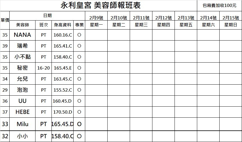 王妃館班表 2025.02.09更新