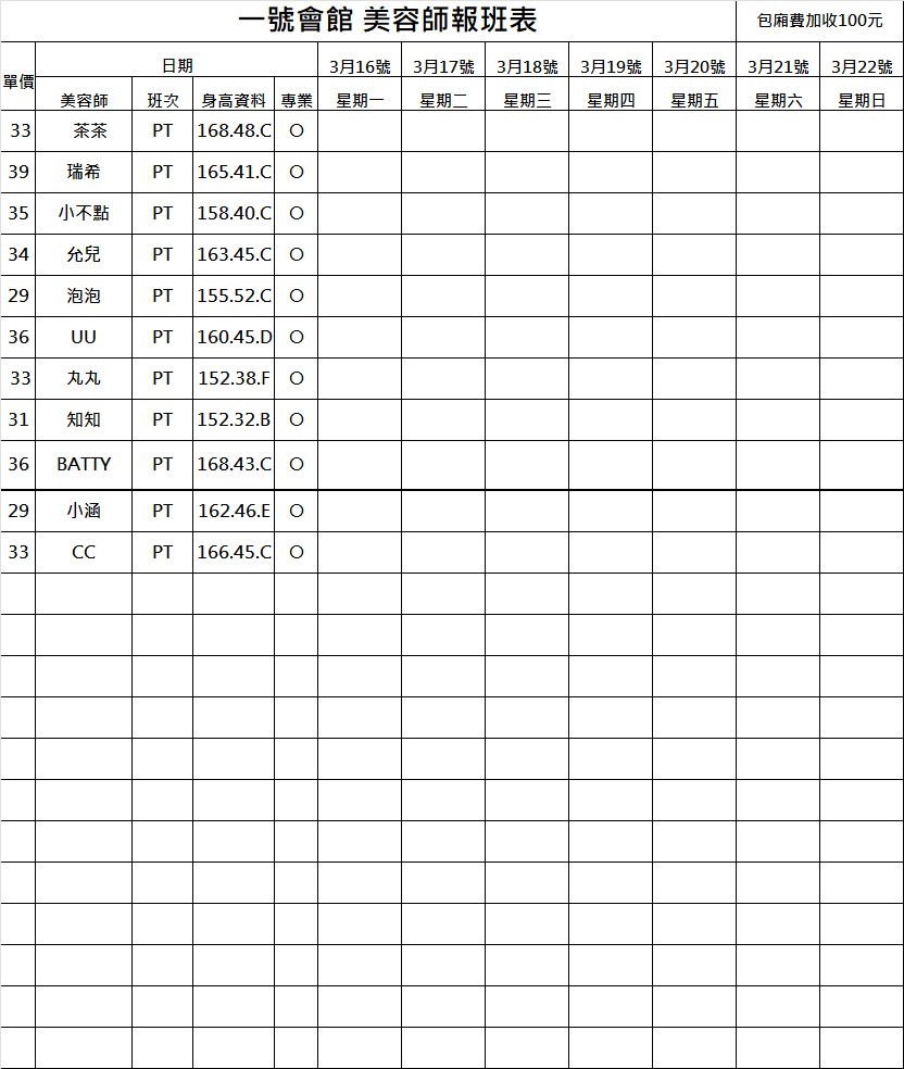 - PT:兼職=想來才來,不會先報班,當天人到後才可約。