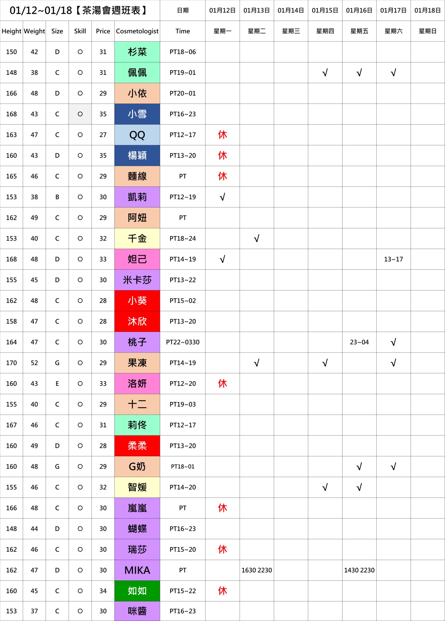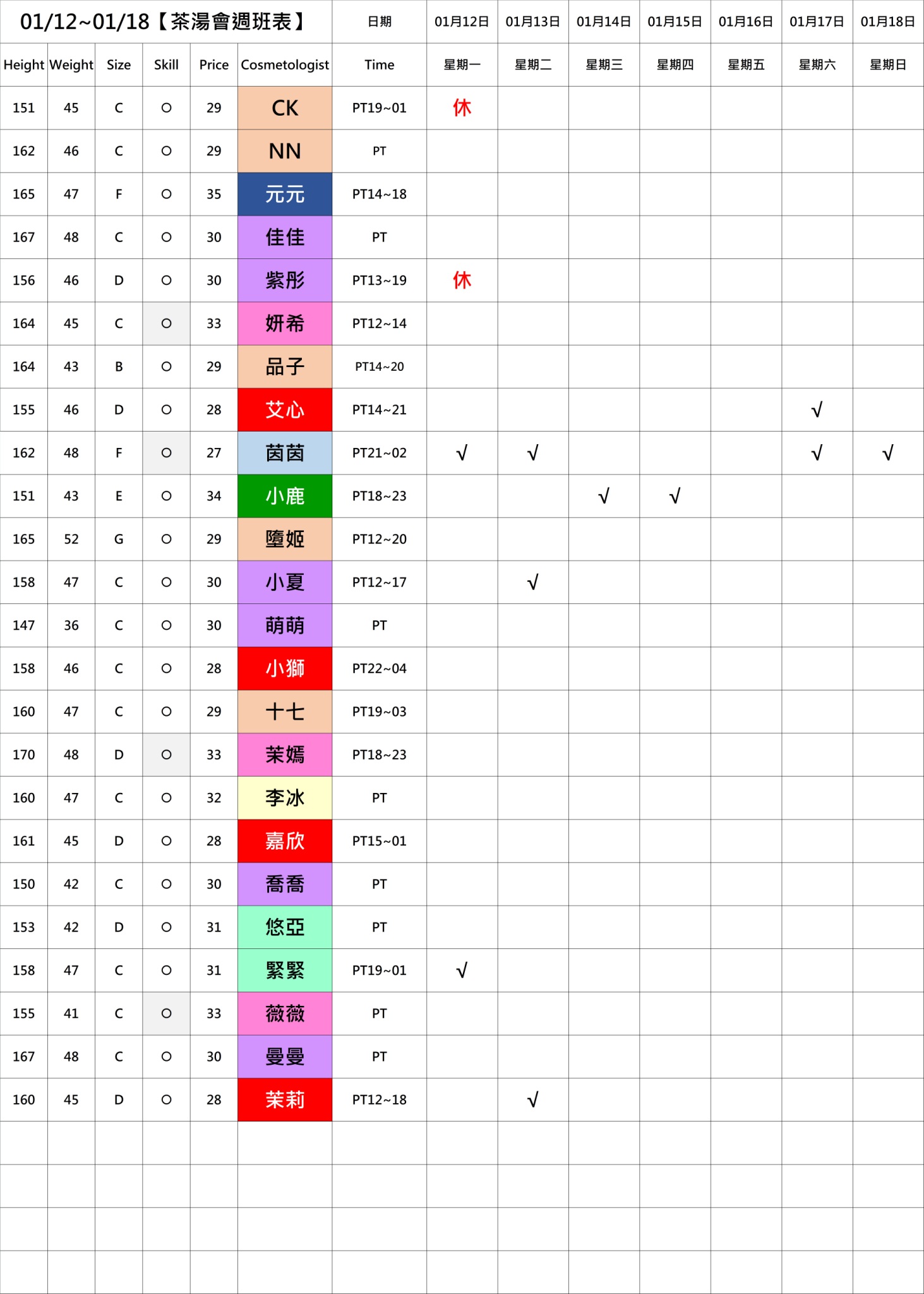 - PT:兼職=想來才來,不會先報班,當天人到後才可約。