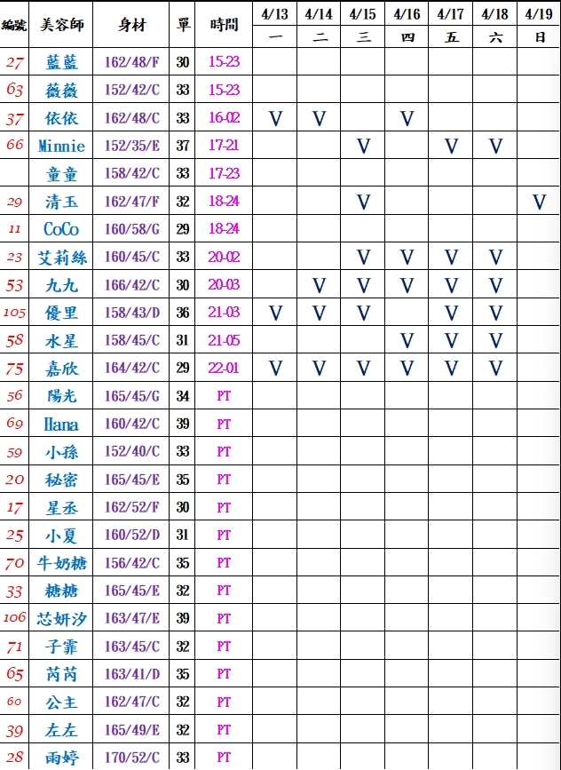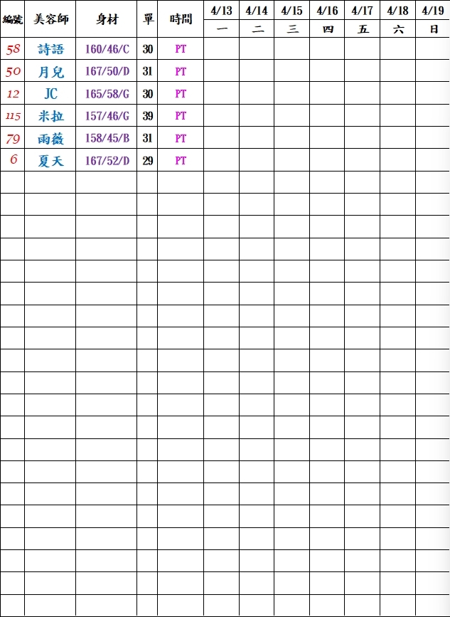 - PT:兼職=想來才來,不會先報班,當天人到後才可約。