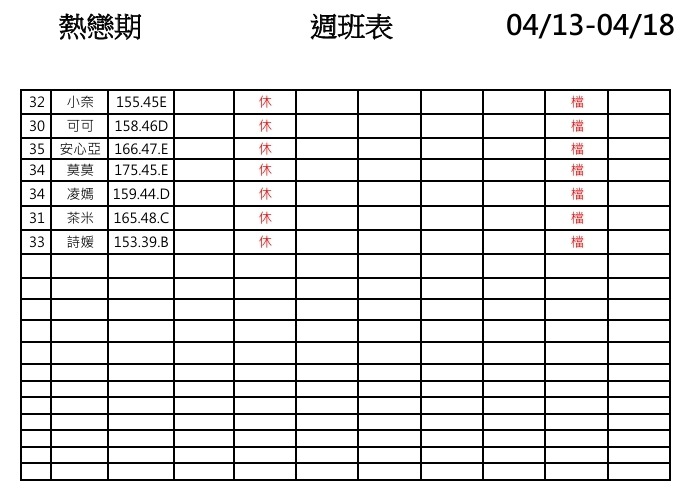 蜜月館班表 2026.04.13更新