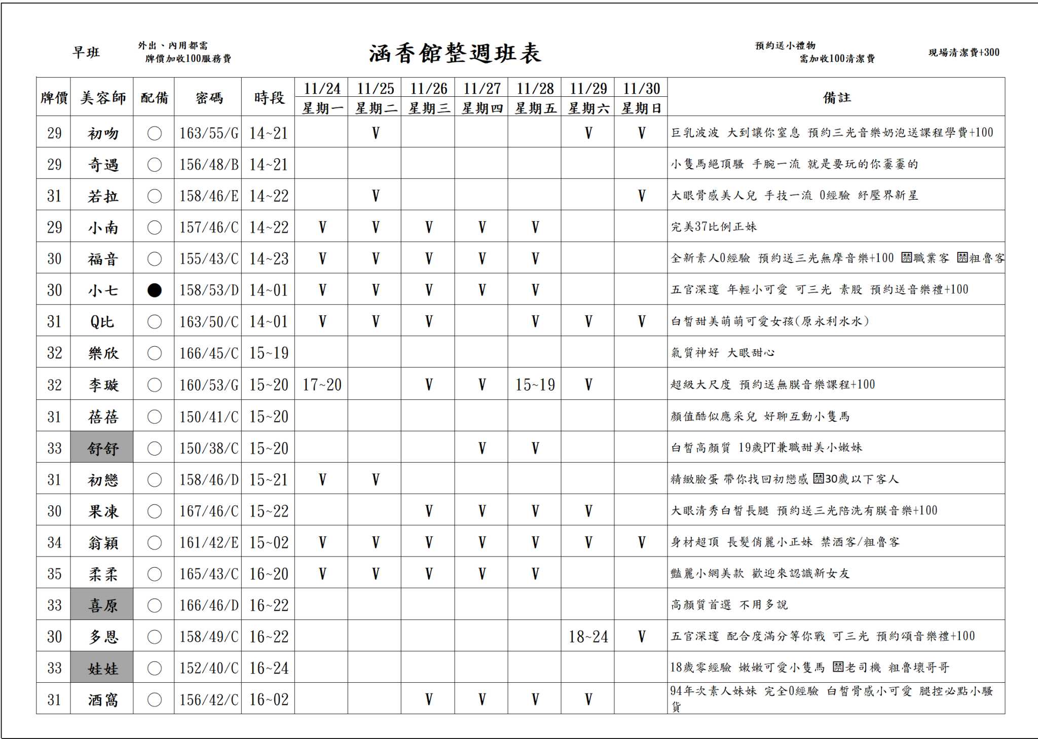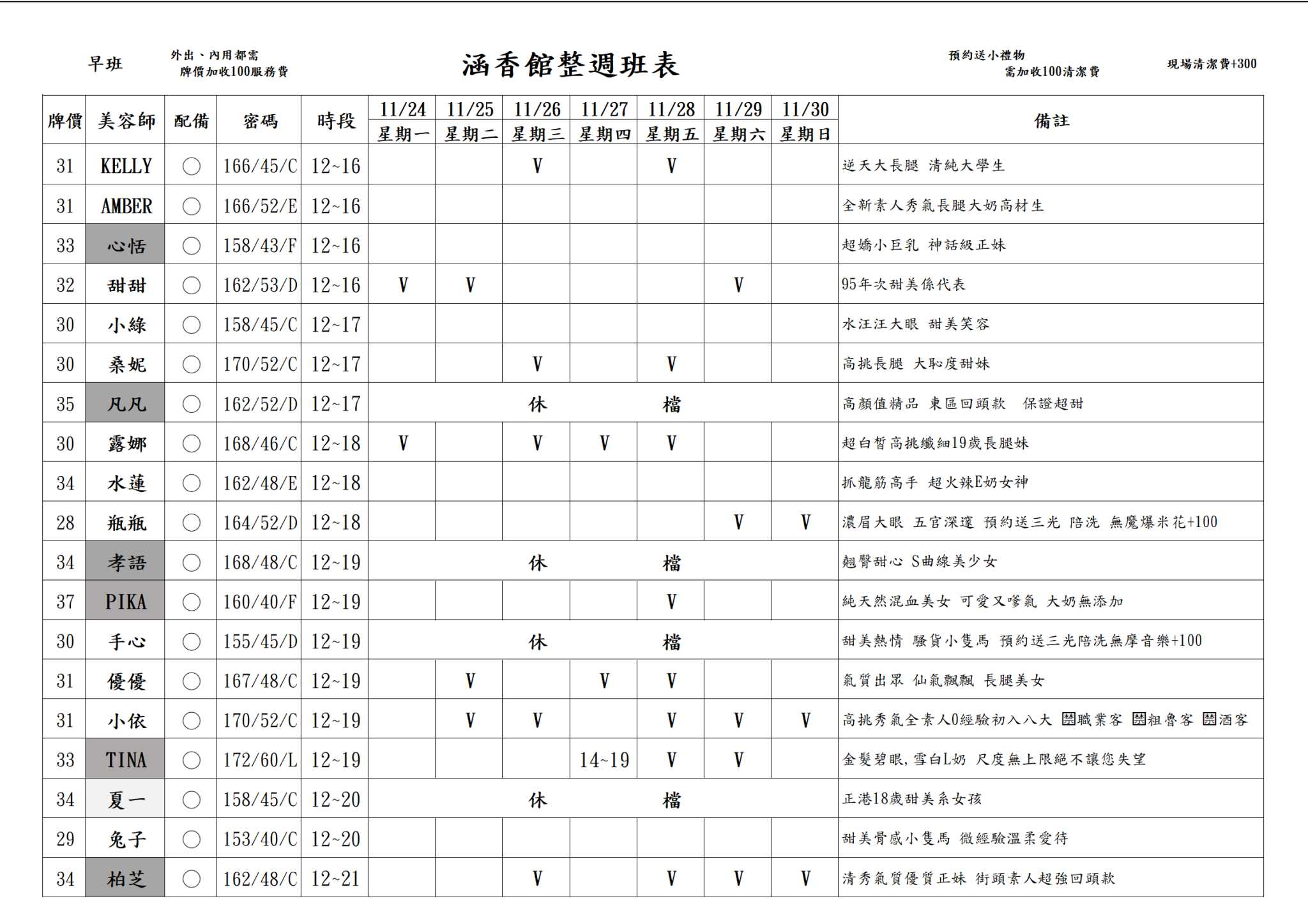 ※註:店內服務需加收 $100 包廂費。續台、外出不需加收。