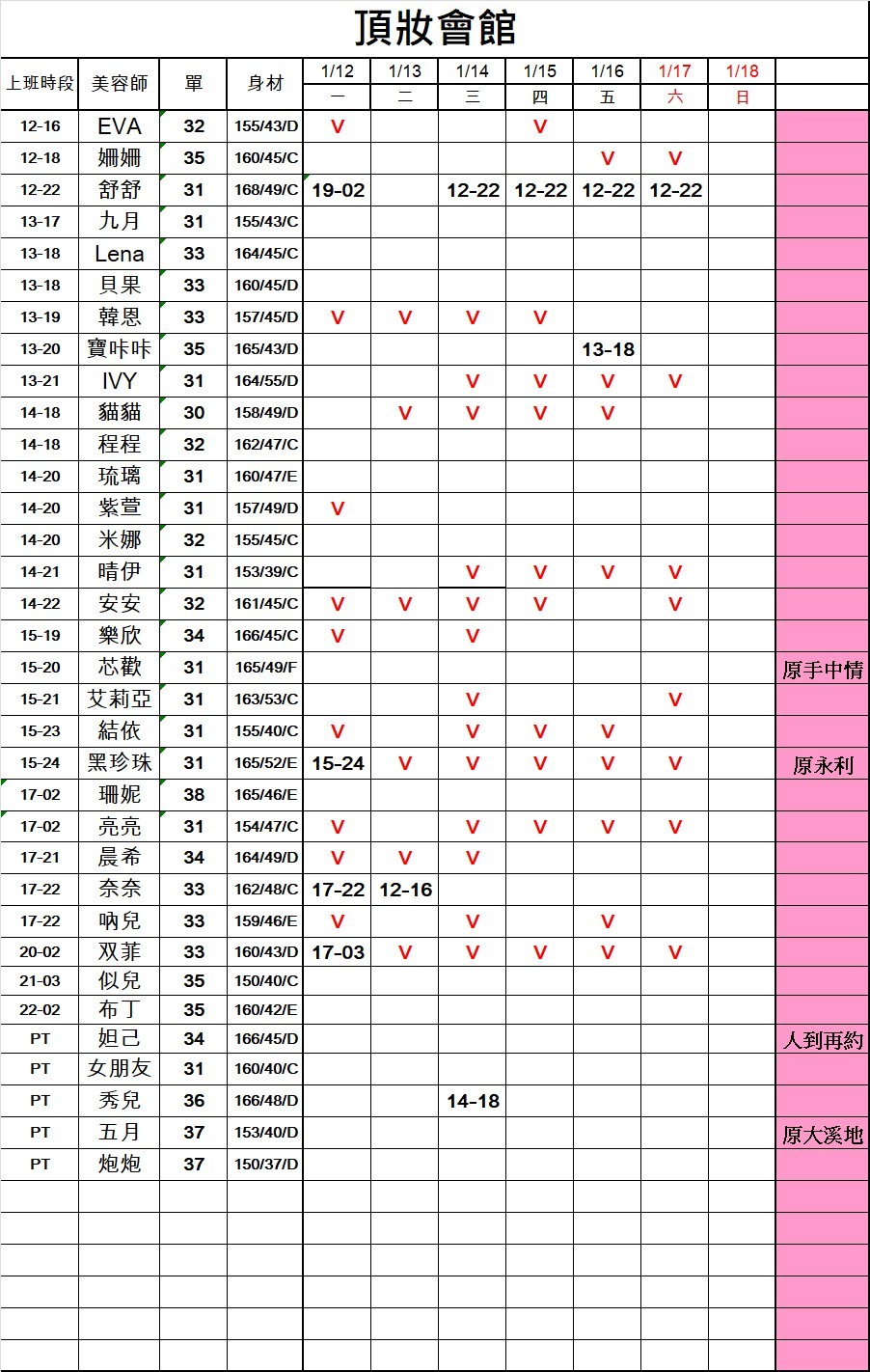 頂妝館班表 2025.01.12更新